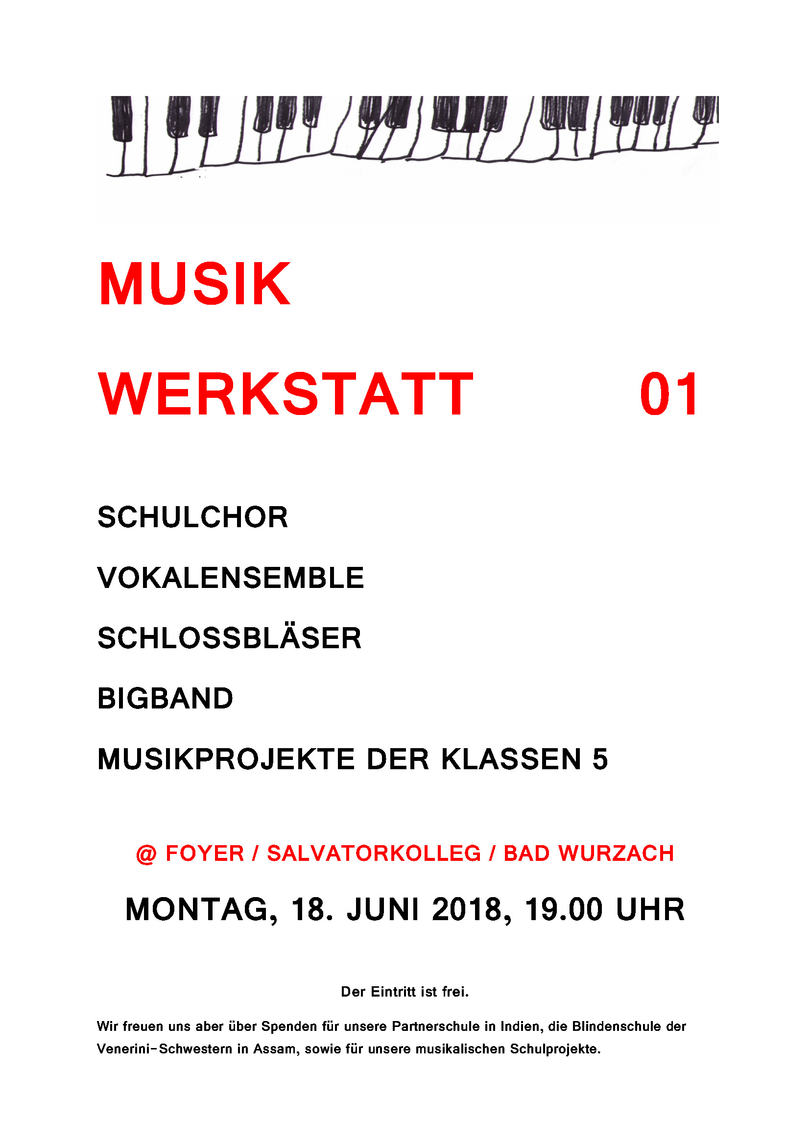 Die musikalischen Arbeitsgemeinschaften des Salvatorkollegs Bad Wurzach laden am Montag, 18. Juni 2018 um 19.00 Uhr zu einem Werkstattkonzert ins Foyer der Schule ein.