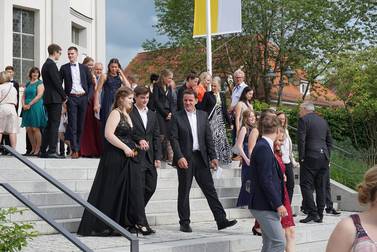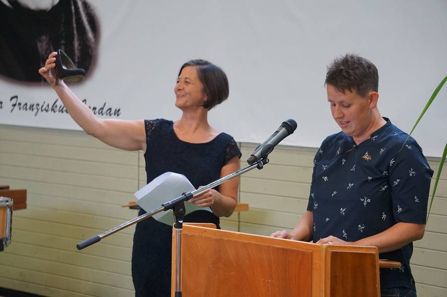 Die Elternvertreterinnen Julia Fischer und Andrea Dennenmoser-Daflos nahmen das diesjährige Abimotto wörtlich und räsonnierten über die Aussichten und Möglichkeiten, die sich den Abiturientinnen und Abiturienten nun bieten, am Beispiel verschiedener Arten von Schuhen. Die Vertreterinnen von Schülerseite, Tamara Roth und Felicitas Schnell, ließen in ihrer Rede die Zeit am Salvatorkolleg mit ihren Schrecknissen, vor allem aber den schönen Seiten Revue passieren und betonten, ähnlich wie zuvor der Schulleiter, die langsame und stetige Entwicklung der Persönlichkeit. Hierzu wählten sie das Bild der Raupe, die sich zum Schmetterling wandelt. Eine gelungene Metapher für einen Prozess, an dessen Ende das so genannte Reifezeugnis steht.